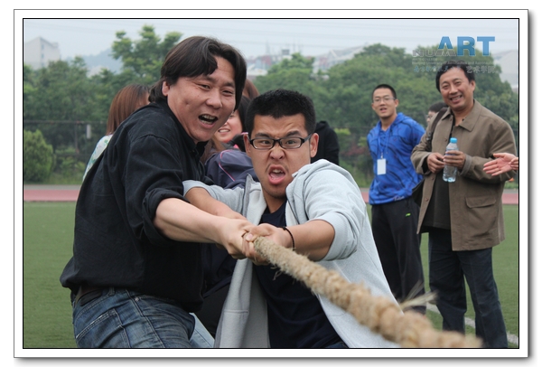 第二轮 “齐心协力”比赛时,天空飘起了点点小雨,但是大家热情不减。一声清脆的哨声之后,参赛队喊着整齐的口号,互相挽着彼此的肩膀,逐渐加速,“一二,一二・・・・・・”大家配合着彼此,以最快的速度冲向终点。