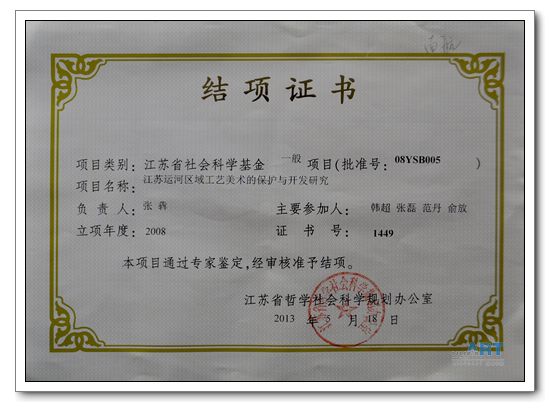 为完成本项目,张�副教授与课题组成员沿江苏段运河的流经区域走向,先后走访了邳州岔河镇良壁村蓝印花布传人王如坤、邳州市官湖镇路口村纸塑狮子头艺人石荣圣、淮安撕纸画艺人华禹谟、扬州剪纸大师张慕莉、常州留青竹刻传人徐秉方、苏州檀香扇技艺传承人邢伟中等民间工艺美术大师和艺人,并考察了淮安博里农民画、苏州桃花坞木板年画等民间艺术形式,共完成系列学术论文9篇,包括3篇CSSCI期刊论文,其中《江苏邳州岔河镇良壁村蓝印花布的调研与保护思考》于2013年1月获飞机杯自慰