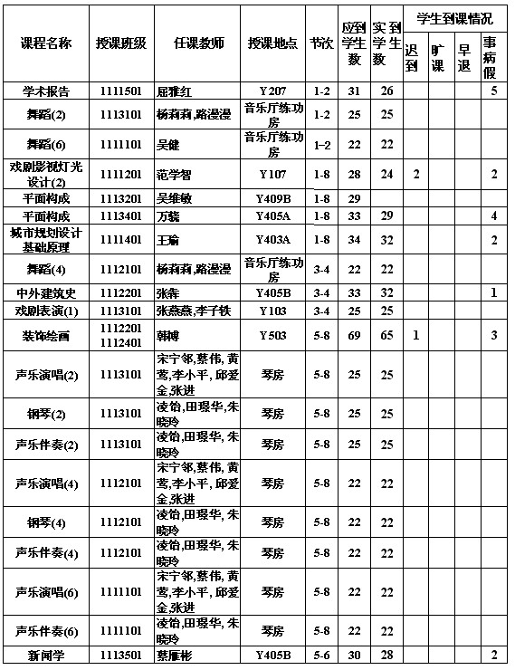 本日共开课20门。其中,上午课程10门(其中七门课程起始时间为8:00),下午课程10门。任课教师23人,应到学生566人次。教师全部到岗。学生迟到3人次,因故未及时返校19人次。总体上看,教师能够认真准备教案,课堂组织有序。绝大多数学生能够按时到课,精神状态良好。学生到课情况详见附表。