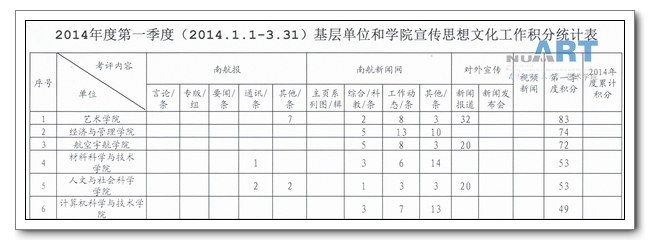 近期,校党委宣传部发布了《2014年第一季度基层单位和学院宣传思想文化工作统计表》,其中我院相关宣传工作考评总积分在各学院中排名第一。