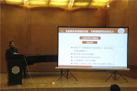 会上,院长张捷做了题为《凝聚智慧 深化改革 推动学院各项事业科学发展》的报告。2014年度,在学校党委的正确领导下,在全体教职工的共同努力下,学院比较圆满的完成了学校部署的年度目标管理与考核任务,办学特色不断强化,教育教学水平稳步提升,党建和思想政治教育工作卓有成效,呈现蓬勃发展的良好态势。张捷传达了学校第十五届党委第十三次全委扩大会议精神。提出了在学校综合改革框架下,学院人事制度改革、人才培养机制改革、科研管理体制改革、目标管理机制改革的重点和举措,并提出了提升人才培养质量、提高师资队伍水平、促进学科科研水平、推进办学资源的争取、加强党建和宣传思想文化工作的具体措施、工作重点和任务目标。她希望全体教职工能够提高认识,和衷共济、共谋发展,切实落实好各项改革举措,奋力开创学院建设发展的新局面。