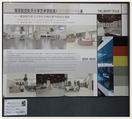 现场一侧布置有艺术设计专业利用3DMAX建模制作的家居模型图,有贴近校园的环境设计,如,为南航东区生态校园规划设计的生态外壳,并用模具制作出模型,还有新图书馆的设计漫游。另外还有创意家居,如《书吧遇上咖啡馆》《存在》等,《存在》是利用木质结构建立的未来创意性家居,作者利用材料搭建了模型。加上昏黄的灯光造型,很具艺术感。而《冥想中心设计》这一作品占地面积很大,作者介绍说是对未来城市建设的一种设想,楼宇以带状形成错落有致的公共建筑,与自然山脉相呼应,体现对自然的尊重与思考。