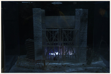 另一面则布置有戏剧影视美术设计专业的作品,有服装的设计,如黄文婷的《糖果娃娃》,《花样年华》里出现的旗袍的设计等。有造型的设计,如《捆绑的艺术》《异型――特效化妆造型》等,《异型》利用模具制作出的怪兽形象,与人等高,形象逼真。但以舞台造型的设计居多,如《朝圣》是对传统舞台的突破,设计有三种,只在现场展出了其中的一个。对《油漆未干》《骆驼祥子》《龙须沟》《听风的歌》等话剧的舞台空间进行创新设计。《空•冥装置分型》利用镜面、图形等对舞台空间进行分割,别出心裁,获得了老师们的一致好评。