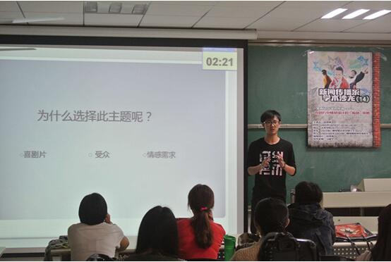 喜剧是人们的情感诉求,但它并不是让人们逃避现实,而是让人们对生活有所感悟。结合这个观点,范泽禹同学介绍了《分手大师》、《煎饼侠》、《夏洛特烦恼》、《滚蛋吧!肿瘤君》等多部国产喜剧影片。在他看来带有“笑中带泪”的电影更能打动人心,给人启发。而其中作为即将要冲击奥斯卡最佳外语片的《滚蛋吧!肿瘤君》,无疑将情感设计的起伏表达发挥到极致,给人以“笑中带泪”的心灵冲击。接着他总结了近年来国产喜剧片情感设计的技巧,包括剧情合理的铺垫、环境场景的烘托、恰当的情感变化以及合适的表达方式等。随后同学们踊跃发言,畅谈见解。老师们也提出了看法和建议,得出“喜剧是对生命的理性认识”的感悟。