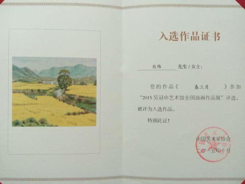 金秋十月,我院熊炜教授油画作品《春三月》入选“2015吴冠中艺术馆全国油画作品展”。此次展览由中国美术家协会、宜兴市人民政府主办,于2015年10月2日在陶都宜兴市盛大开幕,是吴冠中艺术馆首次举办的全国性油画作品展。