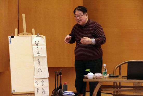 主讲人是八十高龄的韩步璋教授,从事书法研究三十多年,对于甲骨文方面的研究也取得了许多成就。耄耋之年的长者,对于书画的喜爱从他的一颦一笑中、行为举止中、言语交谈中,自然而生。本次讲座的内容主要分为两个部分,首先是对于甲骨文的讲解,这主要是从象形和会意两方面入手;然后是现场猜字活动,韩教授写了十多幅甲骨文作品,观众根据之前讲座所学的知识,现学现用。