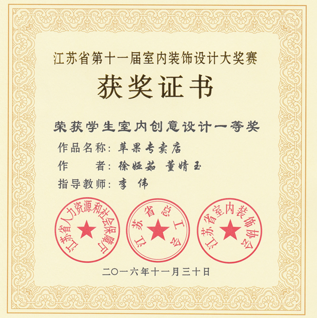 2016年11月30日,“江苏省第十一届室内装饰设计大奖赛”落下帷幕,我院设计专业学生再创佳绩,其中,作品“苹果专卖店设计”荣获学生组室内创意设计一等奖。