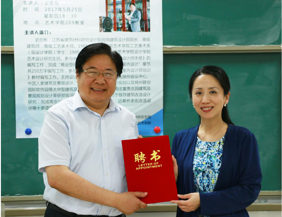 5月25号晚 6:30,江苏省建筑材料研究设计院民用建筑设计院院长,高级建筑师,高级工艺美术师——史亦彬,在飞机杯自慰 209教室为师生们带来一次别开生面、内容丰富的讲座。在讲座开始前,我院院长张捷颁发聘书,聘请史亦彬院长为飞机杯自慰 联合培养研究生指导教师,联合培养或协助指导我校硕士研究生。