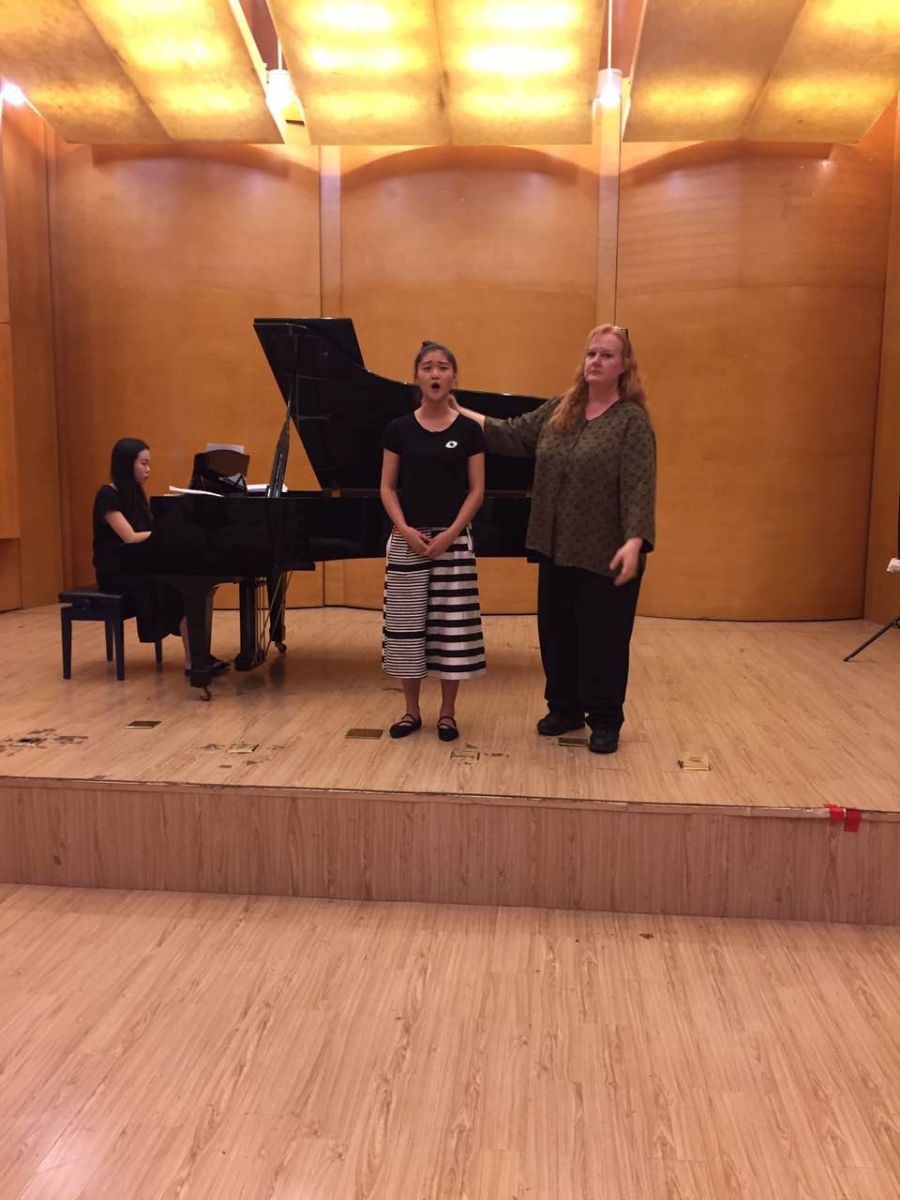 Gayla Blaisdell博士在教学中为同学们规范了歌唱中英语的发声技法,介绍了不同时代欧美英语艺术歌曲的典型风格及发展历史。她通过范唱和积极引导,帮助同学们初步构建了科学的发声观念,规范了学生歌唱中的吐字、咬字及气息运用。面对个别同学在歌唱中的不自信,甚至怯懦回避的问题,Blaisdell教授不断重复着“I can do it, so you can”!帮助同学们逐渐形成了自信而健康的歌唱状态。在完成32课时的课堂教学后,Gayla Blaisdell博士为同学们组织了一场别开生面的音乐会,作为大师班的教学成果向全院师生汇报,音乐会获得在场师生的一致好评。