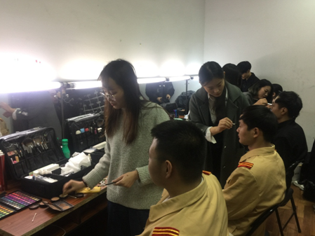 (图为:戏剧影视美术设计专业学生为演员化舞台妆)