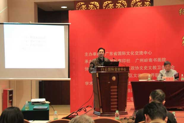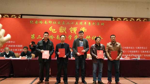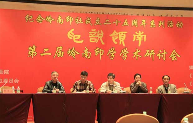 次日,由广东省国际文化交流中心主办的“第二届岭南印学研讨会”在白云国际大酒店开幕,来自中国文联,中国书协,西泠印社,岭南印社、岭南书画院的代表及各论文作者,报刊、网络媒体的二百余人参加了会议。徐畅先生主持会议,孙洵,陈振濂,曹锦炎,孙慰祖,陈道义,黎向群,曲斌、陈开枝、朱万章等著名学者、领导进行了专题发言。大会对九位论文获奖作者进行了颁奖。我院邱世鸿教授的论文《岭南文化中的岭南印派》获奖。该论文从广阔的视野来审视岭南篆刻发展历程,审美追求和特色规划,对岭南篆刻美学之建设提出新的思路。