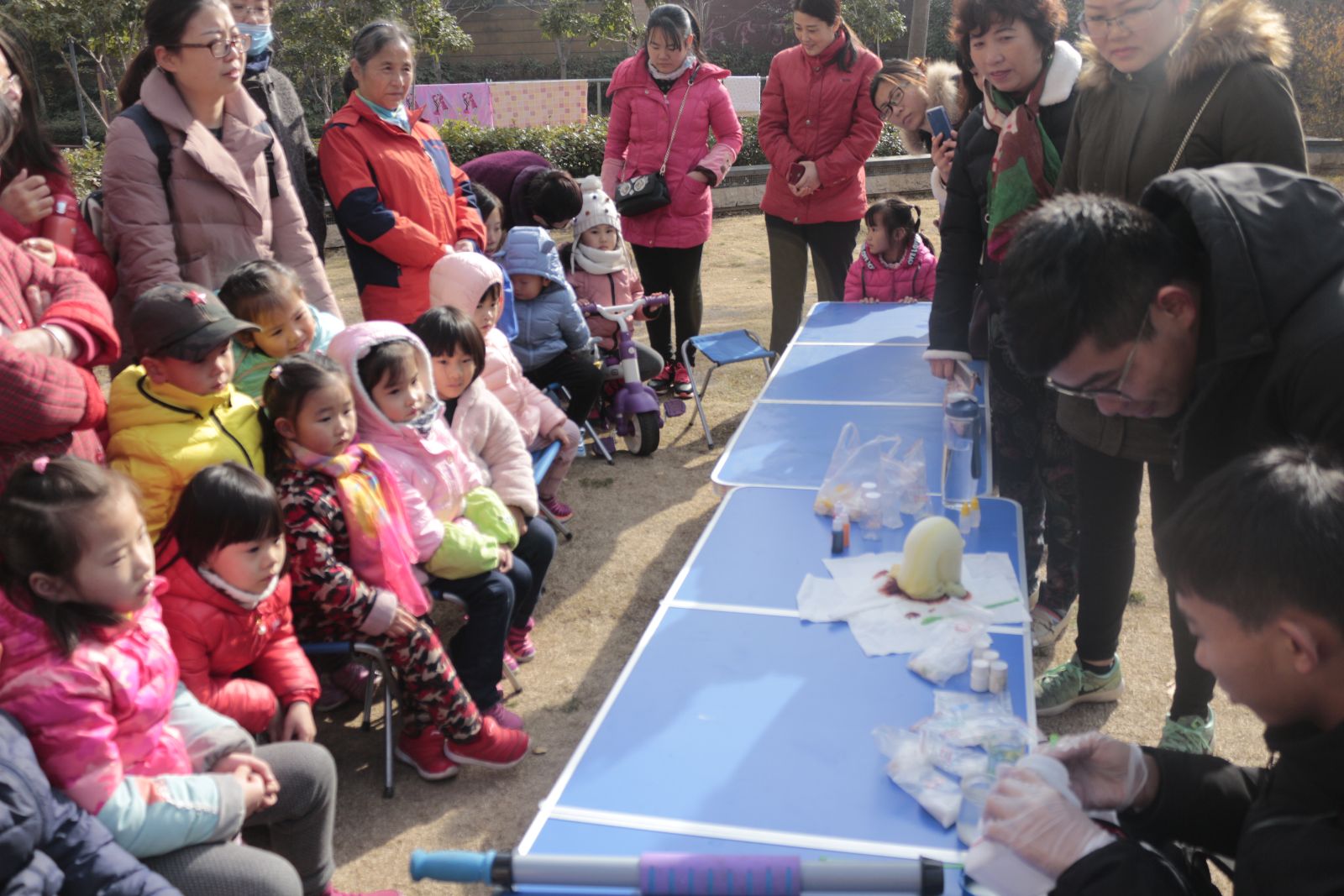 首先由4位志愿者现场做物理实验,第一个是大象牙膏,志愿者们将浓缩的过氧化氢与肥皂混合起来,加上一些碘化钾,一股充满氧气的泡沫状黄色物质像喷泉一样从容器中喷涌而出。现场的小朋友们都惊叹神奇,家长也颇感兴趣。第二个是水中花园,它是金属盐和硅酸钠发生置换反应产生不同颜色的新盐,不断累积成树枝状而发生水中花园现象。许多小朋友凑近观察:“它好像小树在长高!”