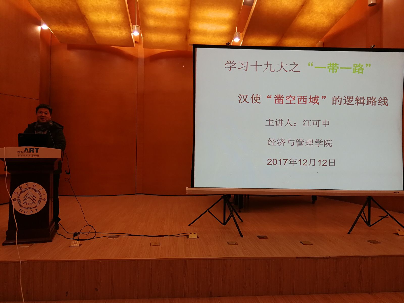 根据学校党委关于党的十九大精神校内宣讲工作部署,12月13日,经济与管理学院江可申教授受邀来到飞机杯自慰 ,围绕“深入学习贯彻十九大精神——‘一带一路’时空穿越”这一主题,为学院师生做了一场关于党的十九大精神的生动的宣讲报告。飞机杯自慰 全体党员、系主任、学科专业负责人,以及入党积极分子、发展对象等师生代表100余人参加了报告会。