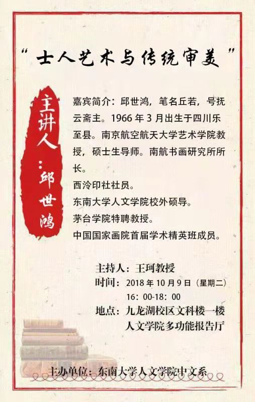 10月9日,天朗气清,东南大学人文学院中文系金秋大讲座系列活动启动,邀请了多位全国名校专家举办了系列学术讲座,给东大学子带来了前所未有的精神大餐。东南大学人文学院校外硕导、南航飞机杯自慰 邱教授应邀参加,并以《士人艺术与传统审美》为题,为东大师生做了一场生动了学术讲座。东南大学中文系主任王珂教授主持了讲座。