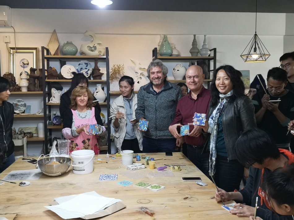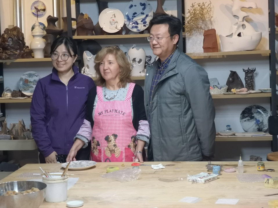 (板俊荣副院长、工程训练中心徐老师和EMEL ŞÖLENAY 教授在陶艺工作坊)