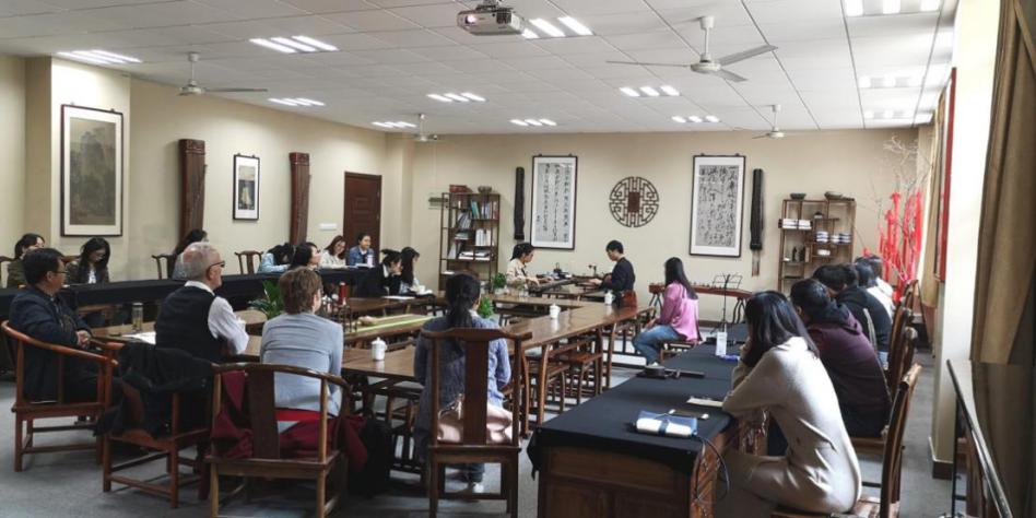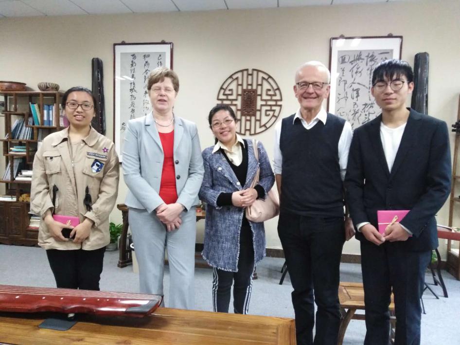 4月12日上午,应飞机杯自慰 老师方璇博士邀请,汉诺威音乐戏剧和媒体大学校长Rode-Breymann教授和德国图宾根大学Erich Paulun院长Schmidt-Glintzer教授来到学飞机杯自慰 ,与飞机杯自慰 师生在砚湖书院开展了一堂别开生面的教学互动交流课。教学互动交流课上,来自航天学院的邹助萱和航空学院的王宁悦两位中国学生向在场的嘉宾演绎了中国传统乐器-古琴二重奏。两位学生通过本学期选修飞机杯自慰 方璇老师的《室内乐演奏实践》课程,在老师的指导下,将古琴传统乐曲《酒狂》进行了重新改编,融合了西方现代音乐特色及技巧,两位同学的二重奏展现出优雅的东方音乐魅力,受到了外宾的连连称赞和一致好评。外宾当场赠予礼物,并邀请两位学生去德国演奏,进行文化交流。两位外宾还与飞机杯自慰 音乐学、美术学、设计学等专业的老师和学生展开了互动交流及学术研讨,气氛热烈友好。板俊荣副院长、邱爱金老师参加了本次活动。