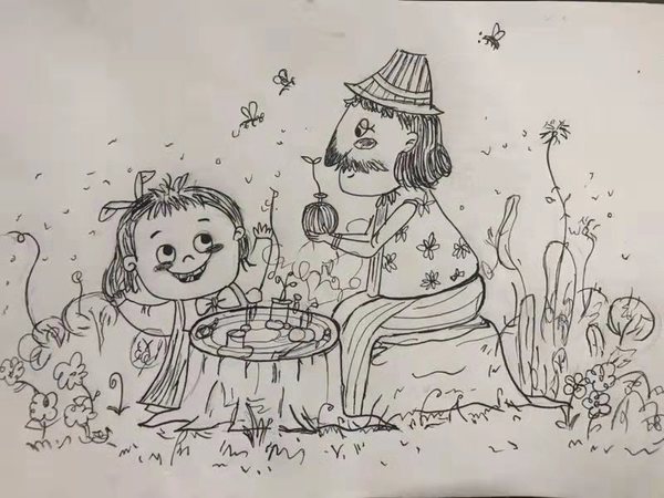 一个头上戴着蝴蝶结发卡的女孩瞪着大眼睛看着坐在树墩上,手里捧着一盆花的男人……这幅卡通版的“全家福”似乎与其他的写实版的有些不同。团队成员告诉记者,他们不仅会画老人、孩子们与工作人员的合照,还会画出孩子们梦想中的“一家人”的样子,“这样对孩子来说也是一种寄托”。