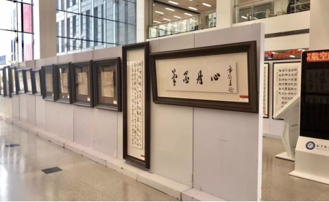 开幕式后,在场师生一同参观展览,展板前,几位退休老教师在一起笑容灿烂地在自己的作品前合影,她们都是南航老年书画研究会的会员,同时是参展作品的作者。其中杨聪英老师有两幅画作在馆内展出,谈起参与活动的感受,她说:“活动丰富了我们的老年生活,和朋友们在一起大家都非常开心。”