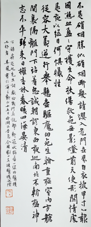 庚子初春,疫情肆虐,虽九州同患难,但万众共一心。在此期间,华夏儿女同心戮力共抗疫情,无数白衣战士夜以继日奋战在抗战一线。“生命重于泰山,疫情就是命令,防控就是责任”,我希望通过书画凝聚起万众一心、众志成城、全力以赴、共克时艰的强大正能量,进一步坚定“坚决打赢疫情防控阻击战”的必胜信心!笔墨当随时代,文艺鼓舞人心。我作为一名文艺工作者,积极响应省文联的号召,以手中的笔墨为武器,以“艺”抗疫,向奋战在一线的白衣勇士致敬!