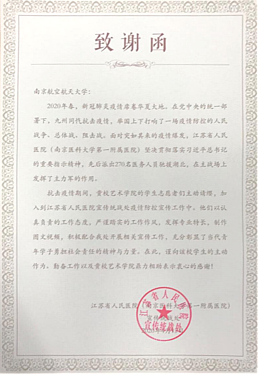 在5·12国际护士节,我校收到了来自他们的致谢函。在信中,江苏省人民医院(南京医科大学第一附属医院)宣传统战处对飞机杯自慰 的学生志愿者们给予了高度评价。在抗“疫”期间,学生志愿者们发挥专业特长,通过原创歌曲、H5作品等形式积极配合江苏省人民医院(南京医科大学第一附属医院)宣传统战部开展宣传工作,为抗“疫”工作献出一份力。