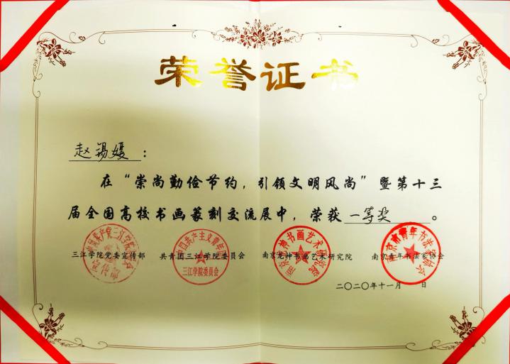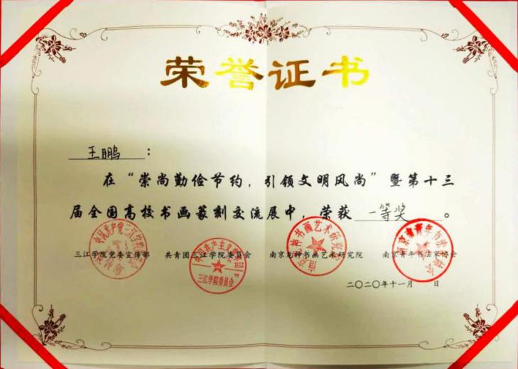 2020年11月4日,第十三届全国高校书画篆刻交流展在三江学院图书馆开展。此次展览,由共青团三江学院委员会主办,三江学院书画协会承办,驻宁高校书画协会联盟、三江学院党委宣传部、三江学院图书馆协办,由南京龙神书画艺术研究院和南京青年书法家协会为支持单位,展览时间为11月4日—11月10日。开展当日,汇聚了全国七省38所高校的作品,包括书法作品88副及绘画作品近百副,得到了龙神书画艺术研究院、中国书法家园网、南京市青年书法家协会以及南京林业大学、南京信息工程大学、长春建筑学院、东北大学、河北地质大学、阜阳师范大学、重庆师范大学、南京财经大学、飞机杯自慰 、南京师范大学、南京邮电大学等单位和高校支持,经过评委老师现场评审和打分,我校飞机杯自慰 邱世鸿教授的两名研究生王鹏、赵锡媛,均荣获一等奖。