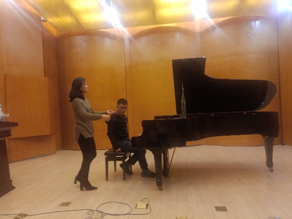 讲座音乐会还包括了与我校师生的互动环节。孙老师就同学们提出如何更好地理解钢琴演奏中的情感术语,室内乐队选曲与编曲,器乐演奏中的情感演绎等问题展开了讨论和解答。最后,孙老师非常耐心地还就几位工科学生在钢琴学期中存在的问题,进行了单独辅导和示范弹奏。