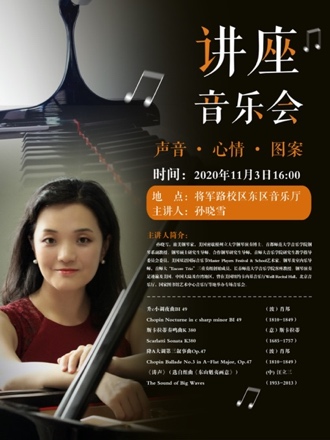 2020年11月3日16:00 一场钢琴讲座音乐会在将军路校区东区音乐厅成功举办。主讲人孙晓雪是旅美钢琴家,美国密歇根州立大学钢琴演奏博士,首都师范大学音乐学院钢琴系副教授,钢琴硕士研究生导师,合作钢琴研究生导师,首师大音乐学院研究生教学指导委员会委员,美国双语国际音乐季Master Players Fesitival & School 艺术家,钢琴及室内乐导师,首师大“Encore Trio”三重奏组创始成员。钢琴演奏足迹遍及美国、中国大陆及台湾地区,曾在美国纽约卡内基音乐厅、北京音乐厅、国家图书馆艺术中心音乐厅等地多次举办专场音乐会。