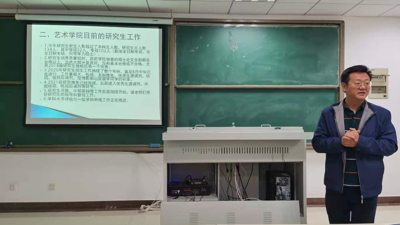 板俊荣院长首先肯定了学院上下在应对疫情、保证正常教学科研秩序中所作出的努力,接着向教职工们介绍了年初以来,学院在人事工作、科学研究、学科建设、研究生招生推免等方面的工作进展。下半年,在做好常规工作的基础上,还将从四个方面着手推进工作,一是,进一步推进“艺工融合、双向驱动”,加强与理工科团队合作,争取新的学术增长点;二是,发挥教授传帮带作用,培育青年教师团队,推动传统艺术发展;三是,凝聚教职工智慧科学制定学院“十四五”规划;四是,积极推进第五轮学科水平评估和新的一级学科申报工作。