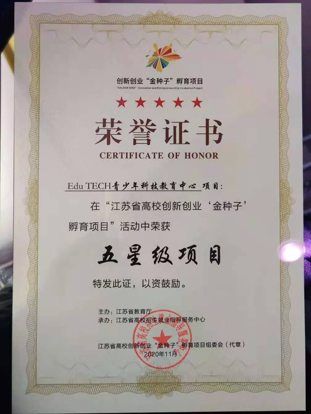 11月28日,由江苏省教育厅主办,省高校招生就业指导服务中心、扬州大学承办的全省高校创新创业“金种子”孵育项目颁奖仪式在常州举行。我院“Edu TECH青少年科技教育中心”创业项目获评五星级项目,并被授予“金种子”称号。