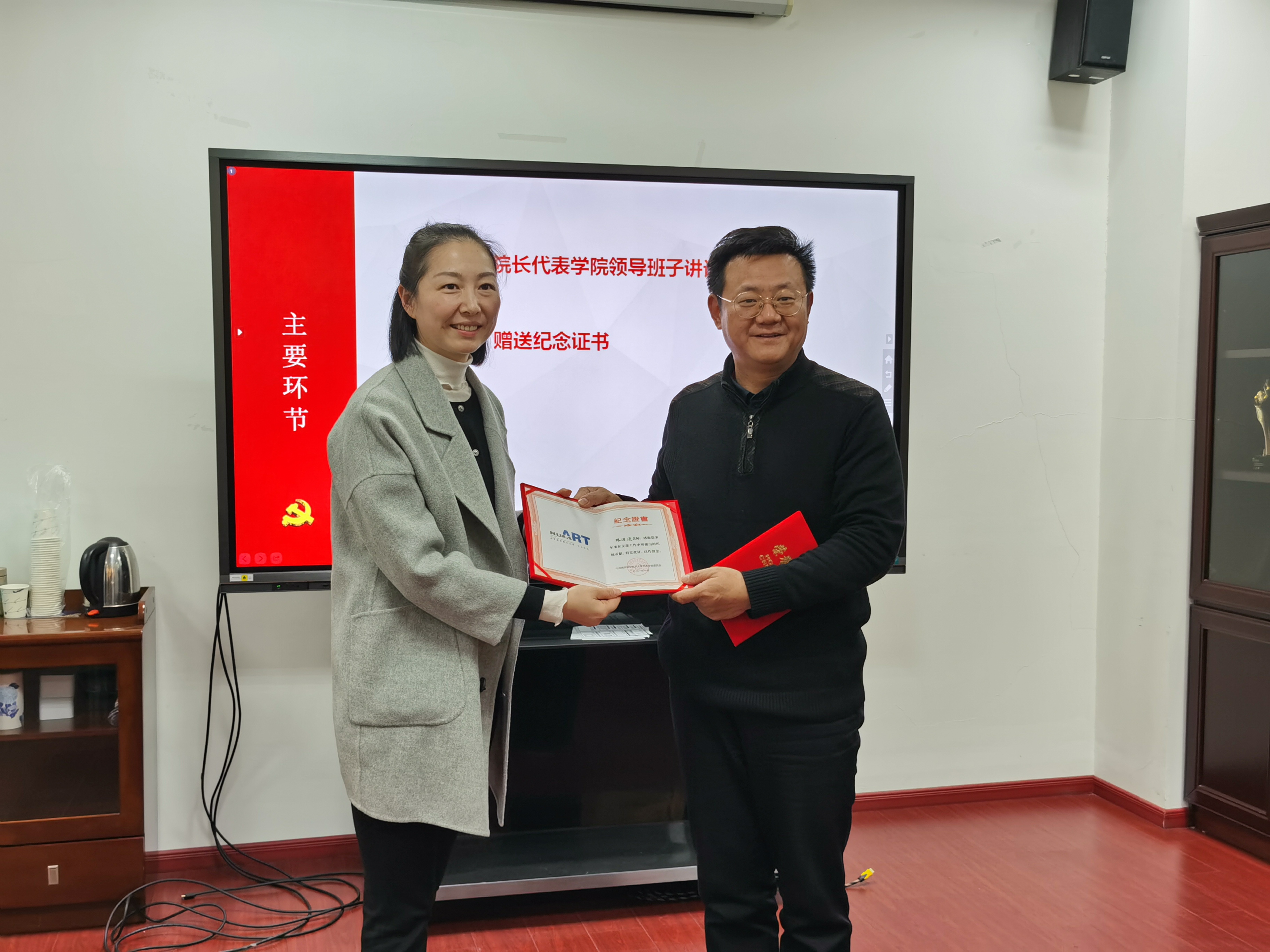 板俊荣院长代表学院领导班子做了发言。他肯定了教工党支部在学院发展建设发展中,起到了聚人心、保稳定、促发展的作用,并对近期卸任的两位教工支部书记,路漫漫、唐庆老师赠送了纪念证书,感谢他们为支部工作的辛勤付出。希望新一届教工党支部委员会,继续发扬优良作风,带领全体党员为学院发展贡献力量。