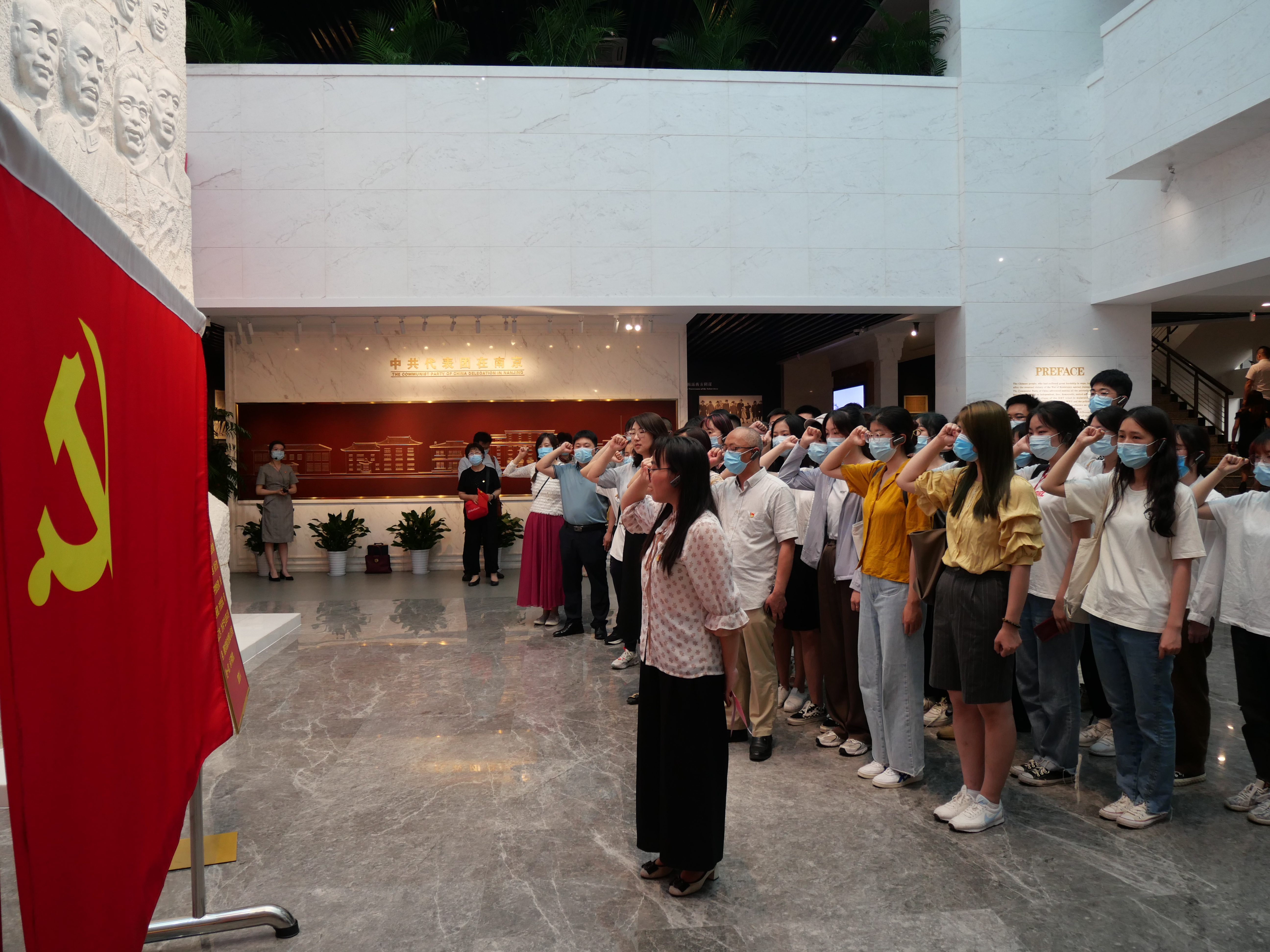 在主展厅,在肃穆的汉白玉浮雕前,党员们面向党旗,进行了庄严的宣誓仪式。