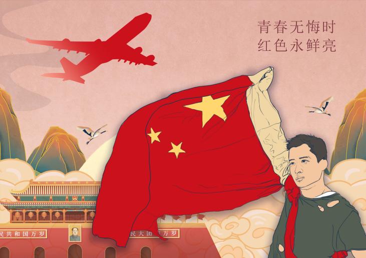 国旗和天安门、鲜艳的红色与黄色是祖国的象征。雷锋与爱国烈士的剪影,代表了满怀热血,无私奉献的英雄。列车、高楼和平鸽,寓意着革命先烈的英勇牺牲,才有如今的和平生活。