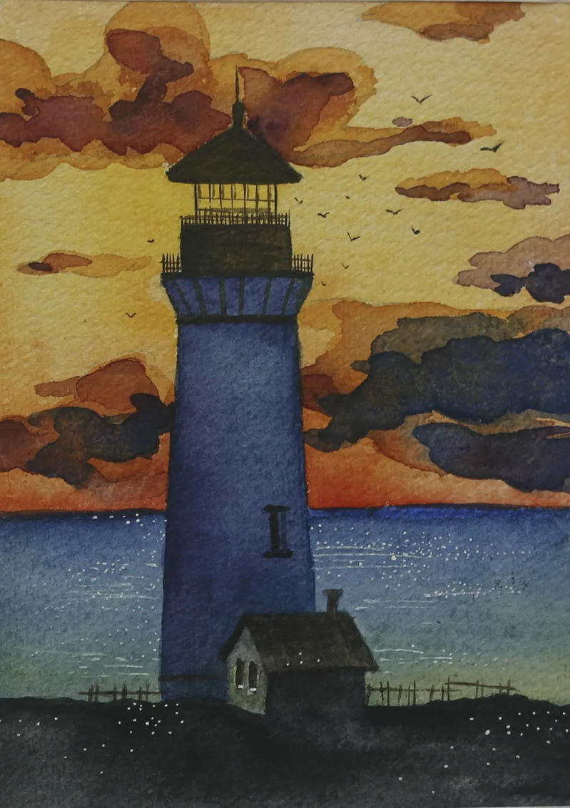在这幅作品的创作中,整幅画中颜色使用的较统一,大多为蓝色和橙色。二者为互补色在整个画面中相互衬托使天与地分离也拉出了整个景色的前后关系,加上灯塔和房子使景色不那么单调,多了一丝生活气息。在远处的天空加上了大雁的影子,在整个画面中起到了点缀的作用。