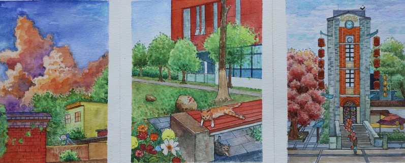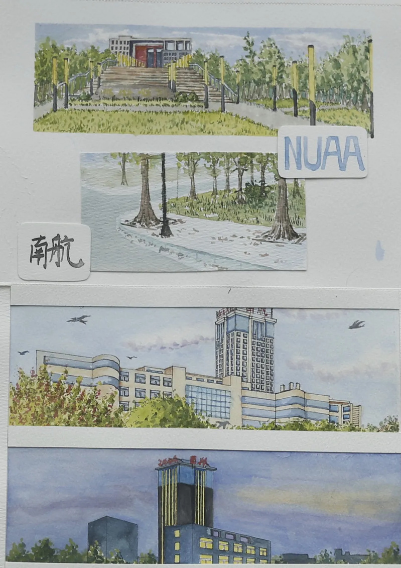 这次的作品是这个课程开课以来我生活环境的一种写照,网课在家到回到学校,我周围的环境一直在变化。南航是我最常生活的地方,而艺术本就来源于生活,一笔一足迹,一步一脚印,有的绚丽辉煌,有的平淡无奇。略过相机,用画笔来记录生活。