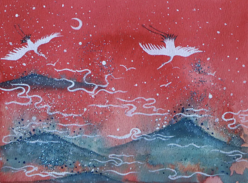 图二:采取中国风的元素,借鉴中国壁画的绘画风格,在画中将仙鹤,群山与云丝等元素相结合,整体风格为红色调,渲染夕阳下仙鹤在群山之上飞舞的景象,带动缕缕云丝。主要绘画工具为色彩渲染,并在色彩渲染后撒一层亮粉起到装饰效果。
