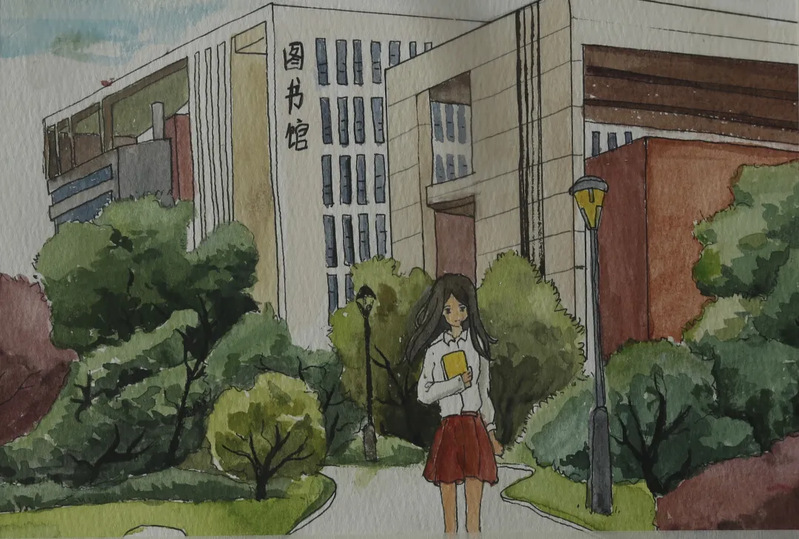 画面呈现的是学校图书馆周围的场景,主要是绿色与红色。不同树的绿色不一样,不用物体的红色也要区分开。以黄绿色为主体色调的画面中添加了少量红色物体也会使画面不那么单调。同时我也在画面中加入了一个女孩的形象,使画面更加丰富。