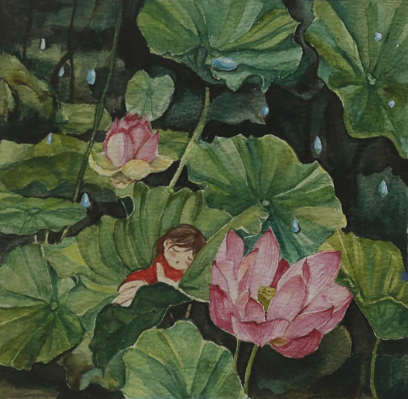 这幅作品的灵感来源于我家小区楼下水景的荷花,画面的色调以及沉睡的女孩,滴落的蓝宝石一样的水珠都是为了营造一种静谧的气氛,当时的创作背景也正是在家中,充分的安全感和平静的心情也侧面表现在了画面中。