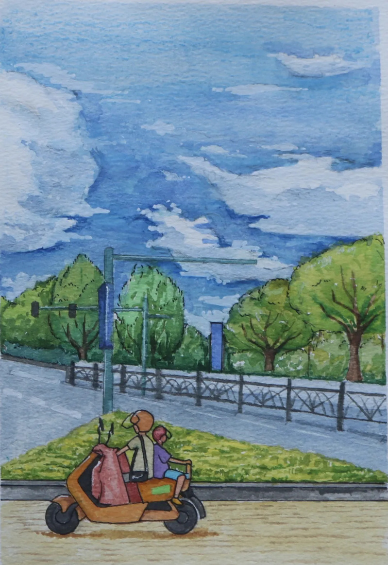 这幅画来自于我拍的一张照片,照片暑假某天经过一个十字路口拍的,那天天空很蓝,白云很悠闲,正好有一位妈妈骑车带着孩子经过被我拍下来,画的时候对天空的刻画有些犯愁,一碧如洗的蓝难以描绘,前前后后改了很多次才好不容易描绘描绘出来。