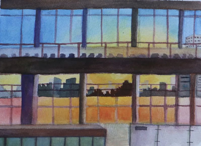 这幅作品灵感来自于一个图书馆里洒满落日余晖的下午。静谧的图书馆自习室,阳光在玻璃上折射出的光彩,周围安静得只能听到刷刷的翻书写字的声,这温馨安宁的一幕,也是我理想中的图书馆的样子。