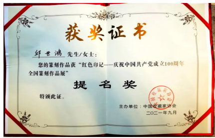 在近日《书法报》书画版公布的新闻获知,由中国收藏家协会所举办的“红色记忆——全国名家篆刻展”评选中,经过终评复评,十名获奖作者脱颖而出,我院邱世鸿教授获得提名奖,成为十位获奖者之一。