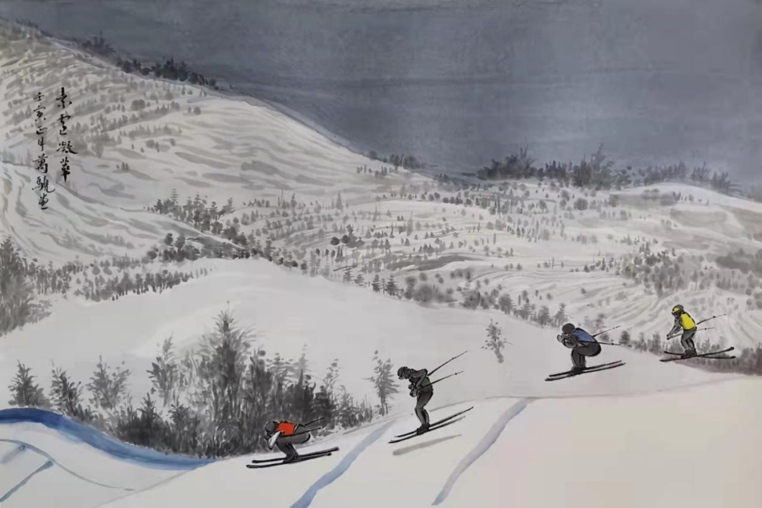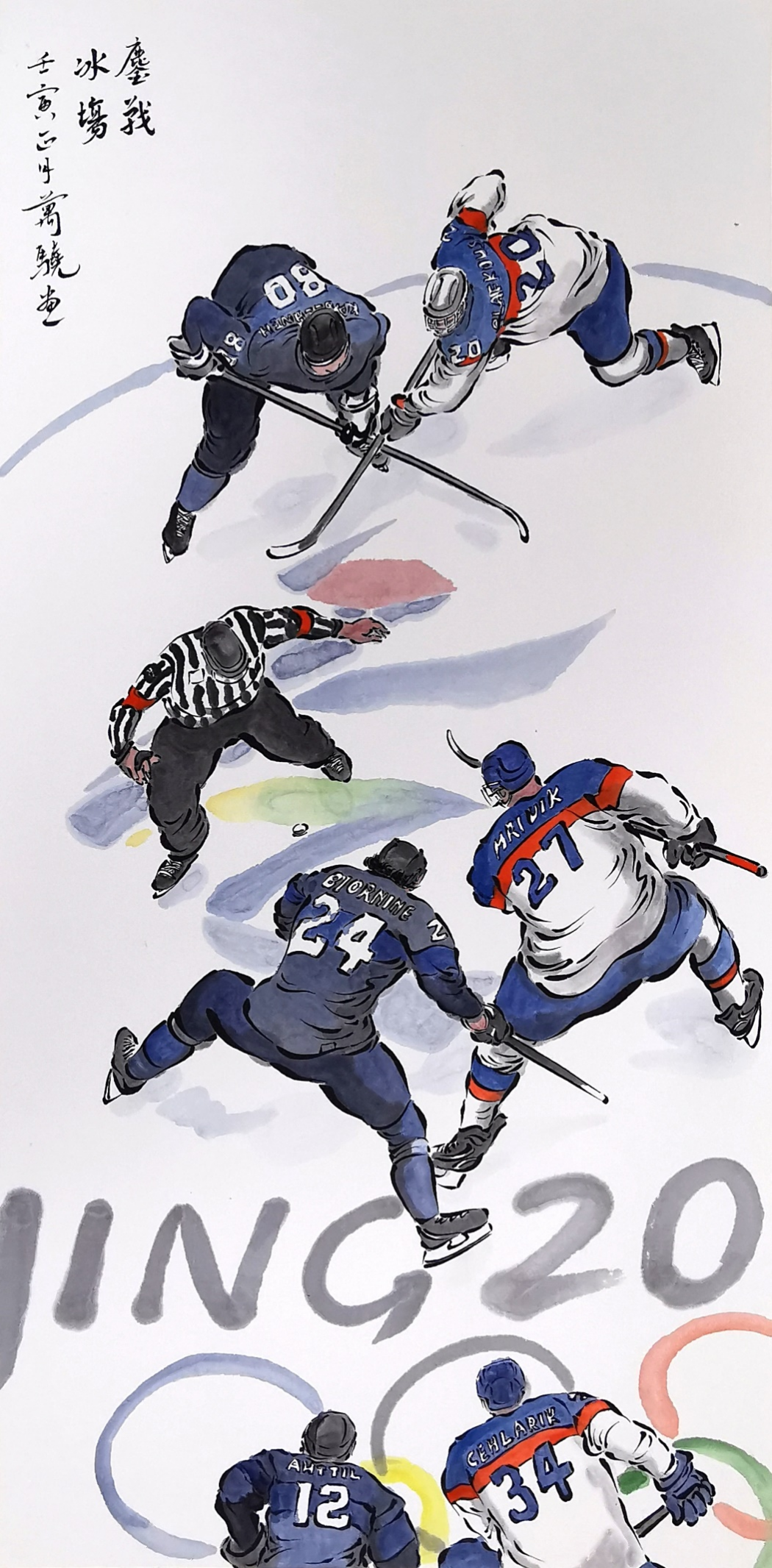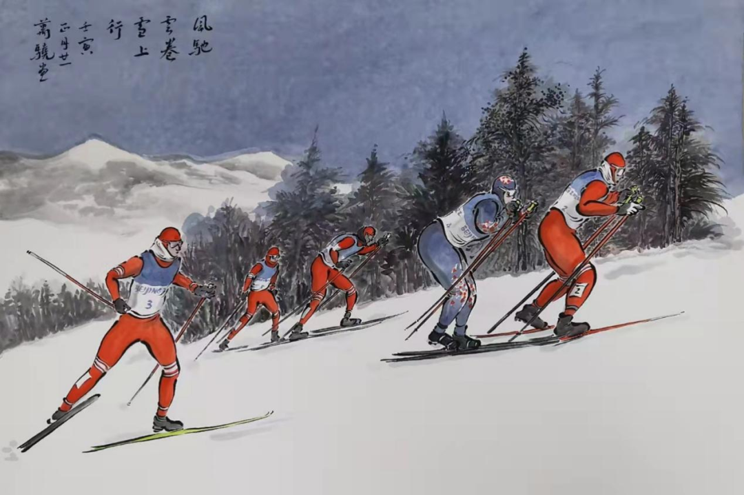 而本次北京冬奥会与此前的东京奥运会相比,“首先比赛项目规则不同,运动员的竞技形体动作也呈现不同。另外,冰雪运动竞技项目,其中有描绘户外冰雪环境的,所以中国画创作中的骨法用笔、水晕墨章、丹青设色,随着素材的不同也在灵活转变。冬奥会的一些比赛项目,运动员配有头盔、护肘护膝、护目镜等护具装备,以及特有的冰刀、雪板等冰雪运动器材,也是与夏季奥运会区别的特点”。