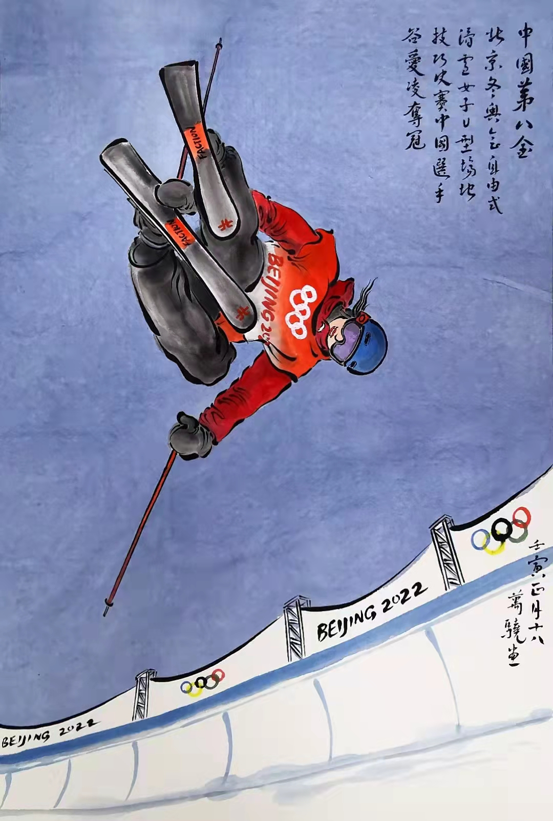 无论是风驰电掣的自由式滑雪女子障碍追逐赛,还是艰苦卓绝的“雪上马拉松”越野滑雪场;无论是谷爱凌的惊天一跳,还是特鲁索娃的“莎莎蟹步”,在万骁的笔下都显得栩栩如生,活灵活现,让人仿佛回到了北京冬奥会直播现场。万骁直言,每种冰雪运动项目的竞技动作各具特色,有所不同。