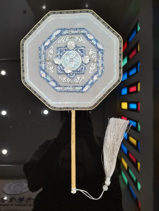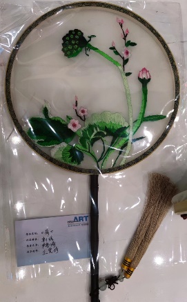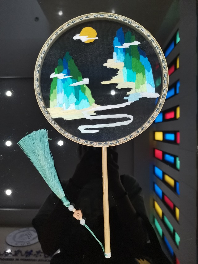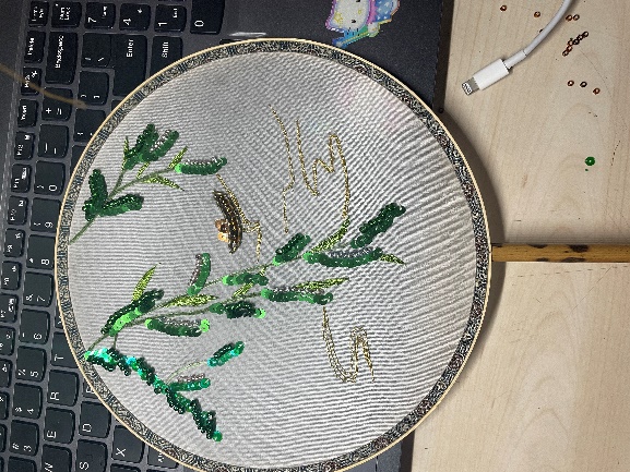《绿》这个团扇用珠绣的方法,把不同的绿色用不同的材质表现出来,简朴与华丽相结合。