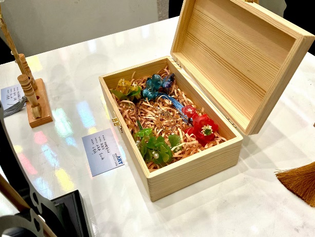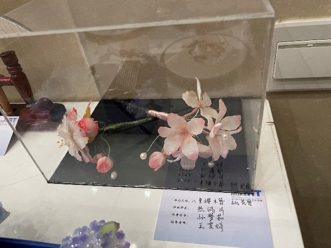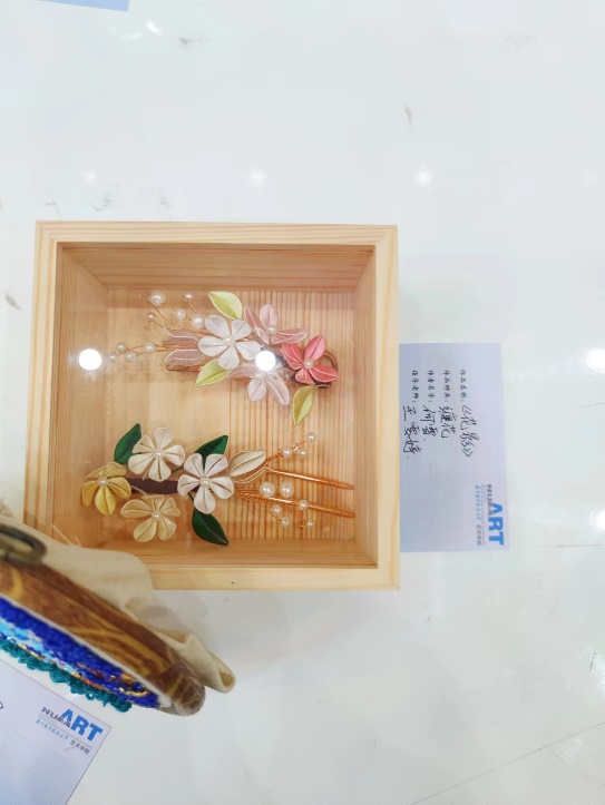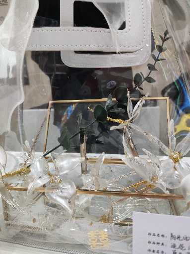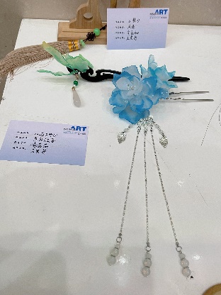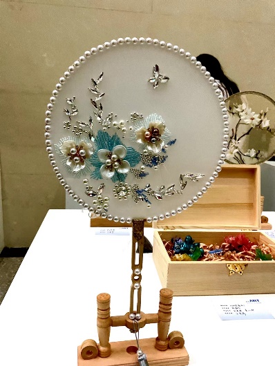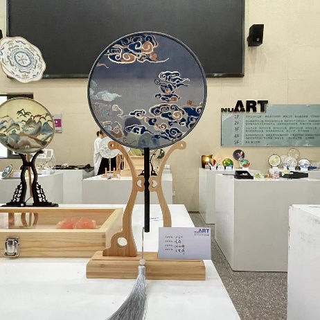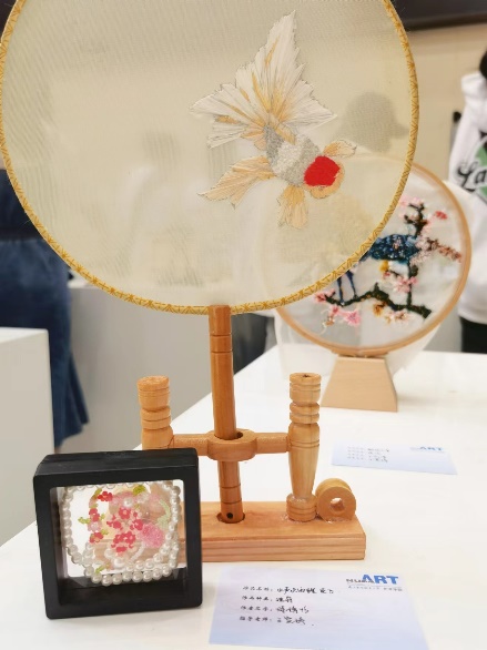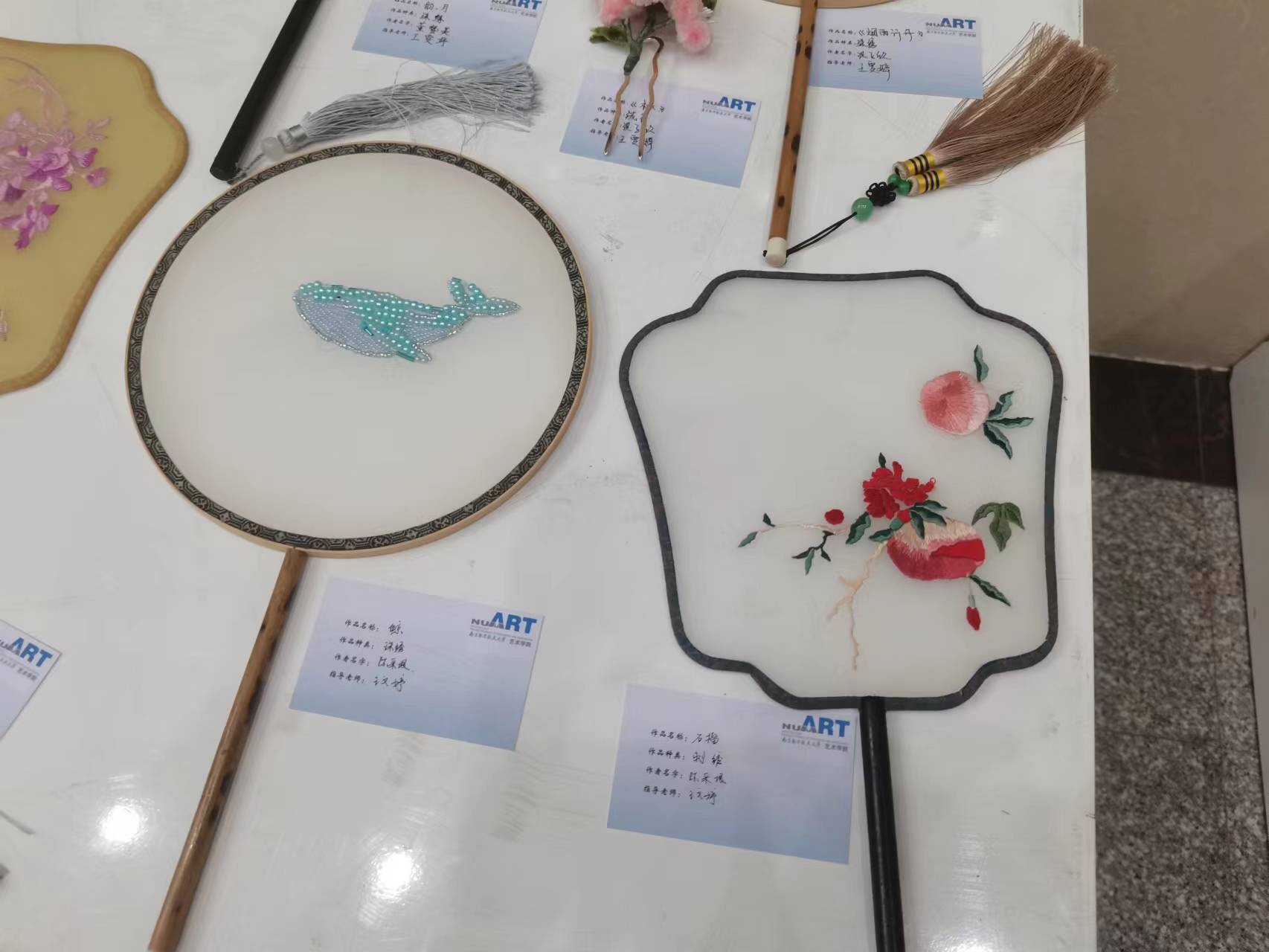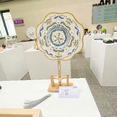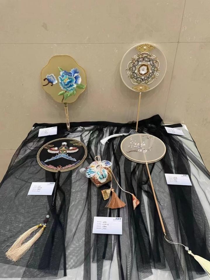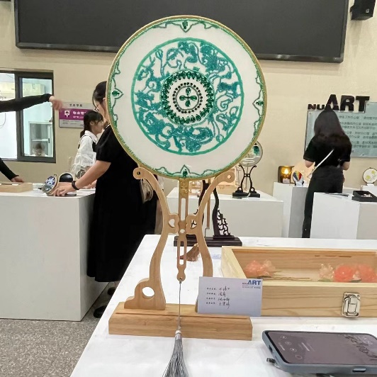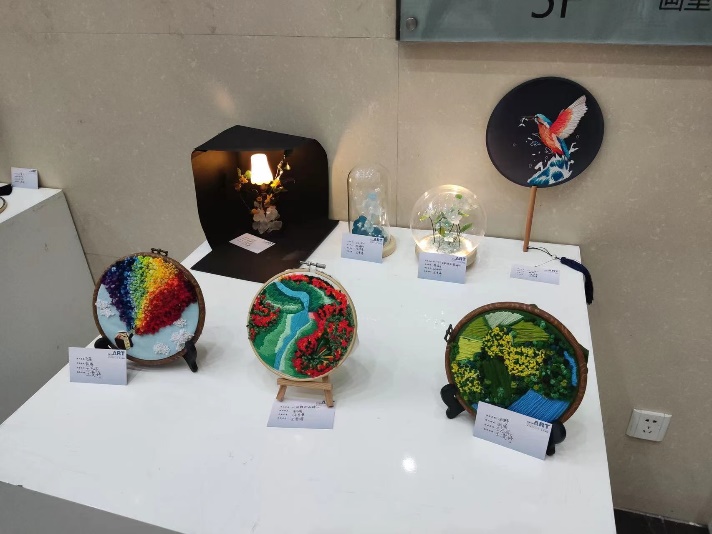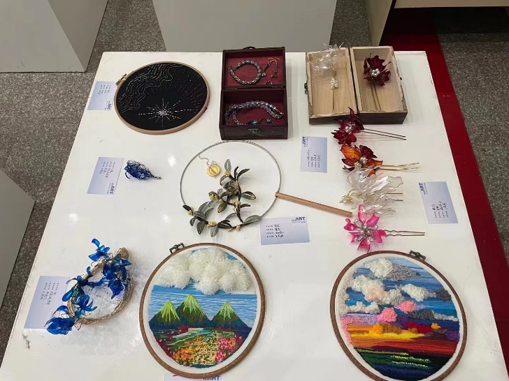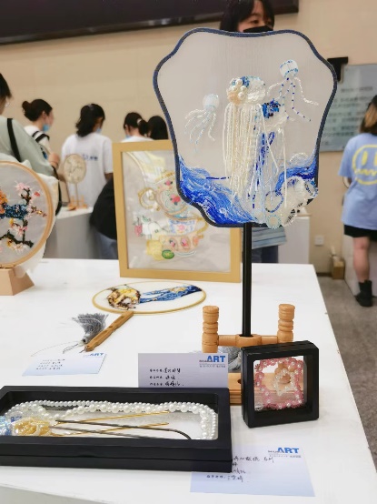 在展台上,我们可以看到来自21级学生们各式各样的手工作品,其中运用了包括刺绣、珠绣、缠花、绒花、香囊、热缩片、扭扭棒、造化液等各类“图案”手工制作方式,以最为直接的手工实践展现出了中华传统文化当中的图形美。