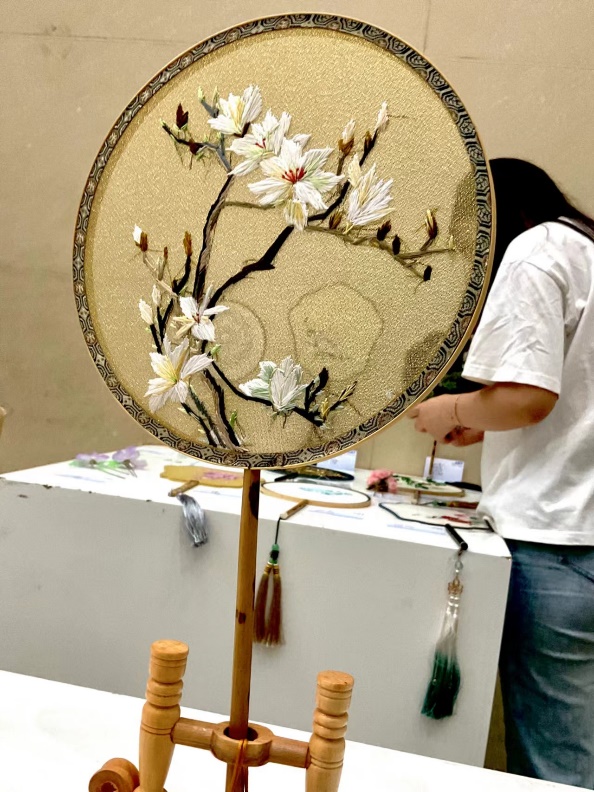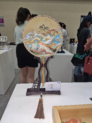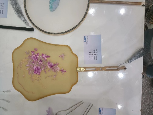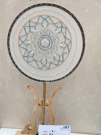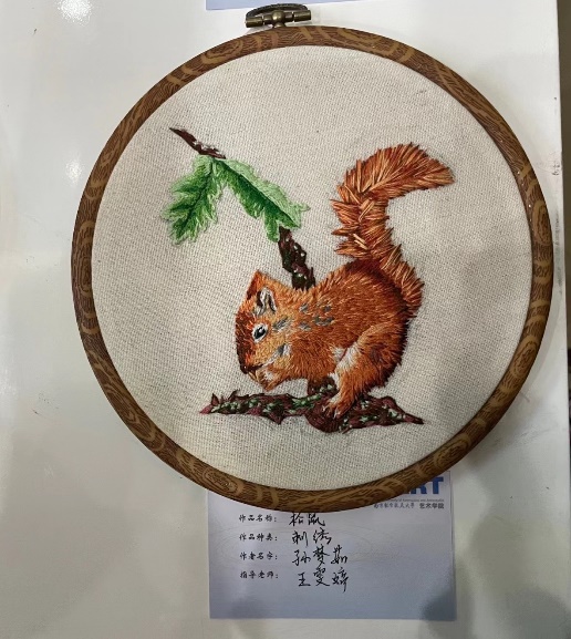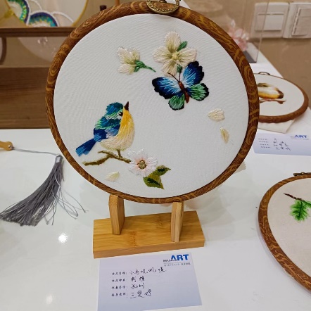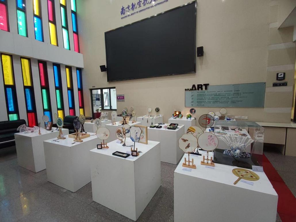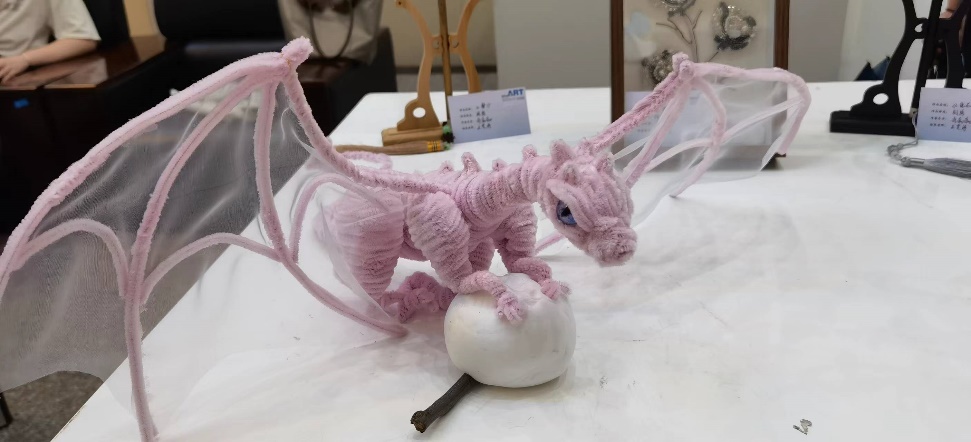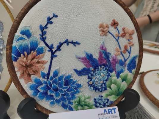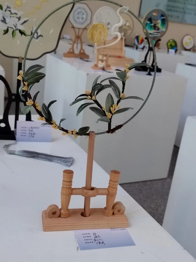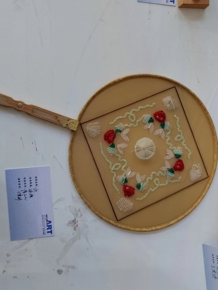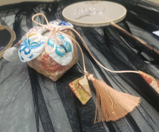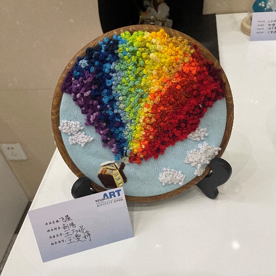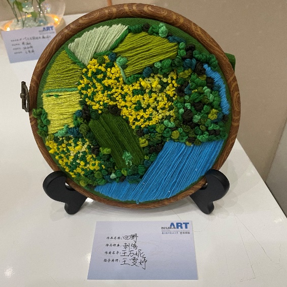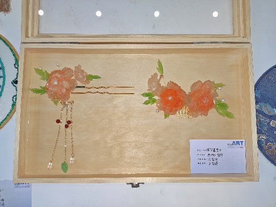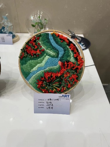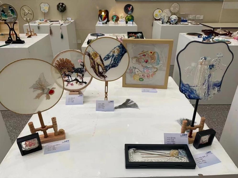 在展台上,我们可以看到来自21级学生们各式各样的手工作品,其中运用了包括刺绣、珠绣、缠花、绒花、香囊、热缩片、扭扭棒、造化液等各类“图案”手工制作方式,以最为直接的手工实践展现出了中华传统文化当中的图形美。
