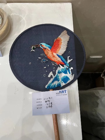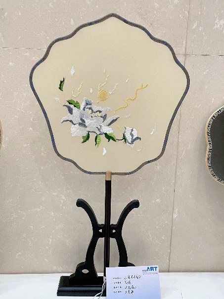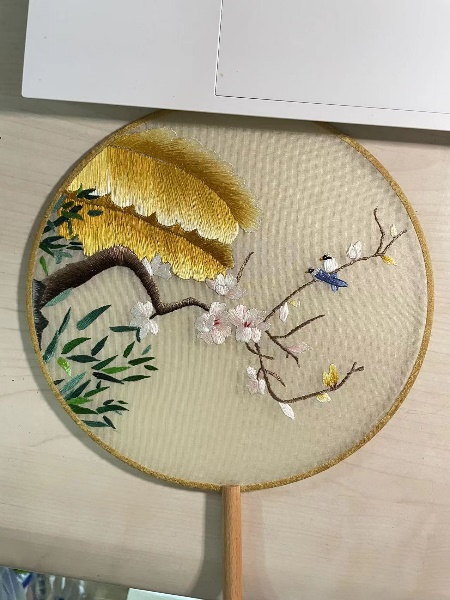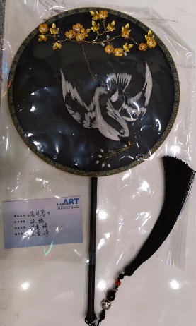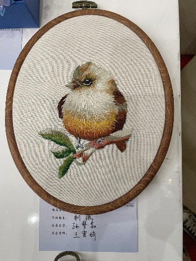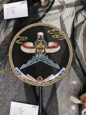 《笼中鸟》采用珠绣结合刺绣的手法,表现出鸟儿被囚禁的痛苦状态,设计构思来自于《延禧攻略》中的富察皇后。该作品以黑、白、金为主色调,以采用黑扇面,用金箔片、珍珠、金线绣出困住鸟儿的树枝,以白色刺绣为身体、黑色珠绣为瞳孔赋予鸟儿生机,连接两者的则是金色的链条与缠绕着的黑色丝线,突出主题“笼中鸟”,表现物质、权利下的困局与挣扎。