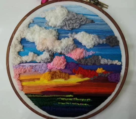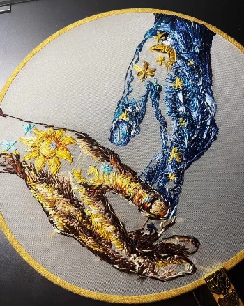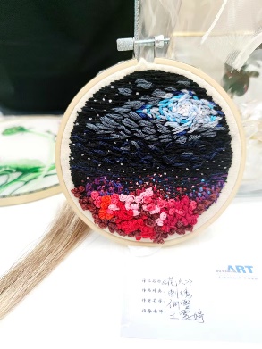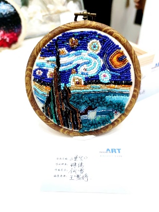 这幅作品的灵感来自于梵高的星空,略做了改动,用珠绣绣出它的颜色,使得整幅画面更加光彩透亮,在用打籽针在边缘绣出花草树木,使得画面内容更加丰富,最后使用平绣,使得画面凹凸起伏,层次感更加的鲜明