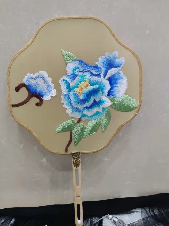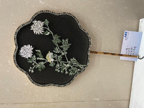 作品以紫藤萝为主题,一簇盛开的紫藤萝,枝叶缠绕,点缀一只蝴蝶。图案为紫色单色,请新秀丽,色调统一,搭配复古的黄色扇面,形成呼应。花朵的颜色细腻渐变,由深入浅,蜿蜒的藤蔓自然生动。构图重点集中在扇面右边,构图灵活,有松有紧。