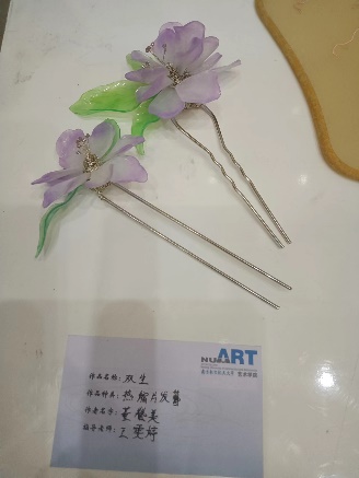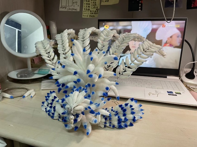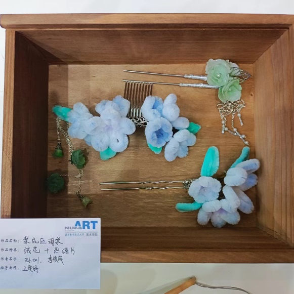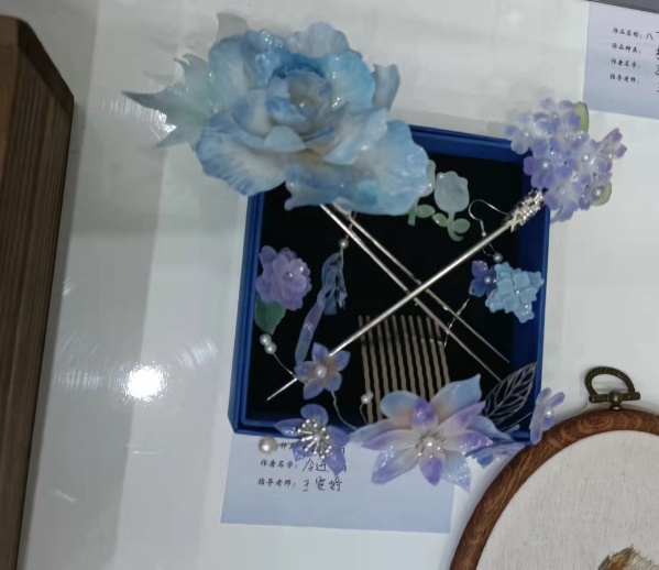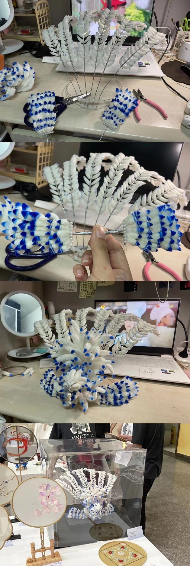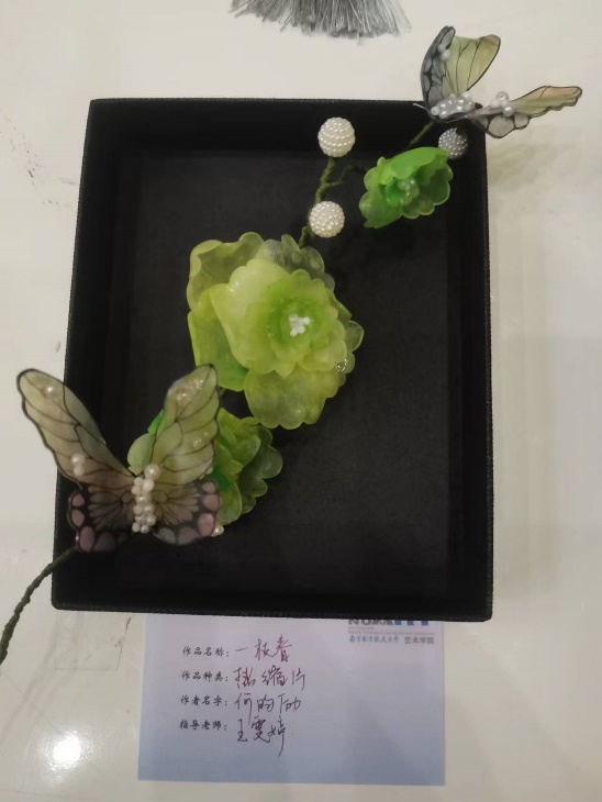 李筱彧和孙圳共同完成的《梨花压海棠》。上面蓝色分布的绒花是梨花,采用的是淡蓝色的绒花,青绿色的海棠是用热缩片制作而成,主发簪,绒花排列在主要部分,流苏是由,梨花组成,佩戴时融化在上流苏自然垂落,表现主题