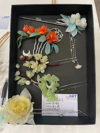 “色样多无定,花纹斗不完。”漫步在12个展台间,同学们的作品用不同的形式,不同的色彩搭配使得图案之美愈发熠熠生辉——刺绣作品恍若一位为古典美人,在每一个独特主题的赋予下,身着不同的衣衫,向我们款款走来,成套的古风首饰则有的超俗、淡雅,体积不大却十分精致,还有的配色丰富,在灯光下变化多端……这些作品让人看到后不禁眼前一亮,老师们也忍不住啧啧赞叹。